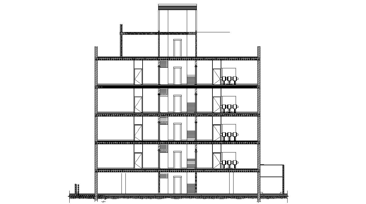 this is 4 storey apartment building cross-section drawing includes basement parking floor, RCC floor slab detail, and wall section design. download DWG File of apartment building section drawing.