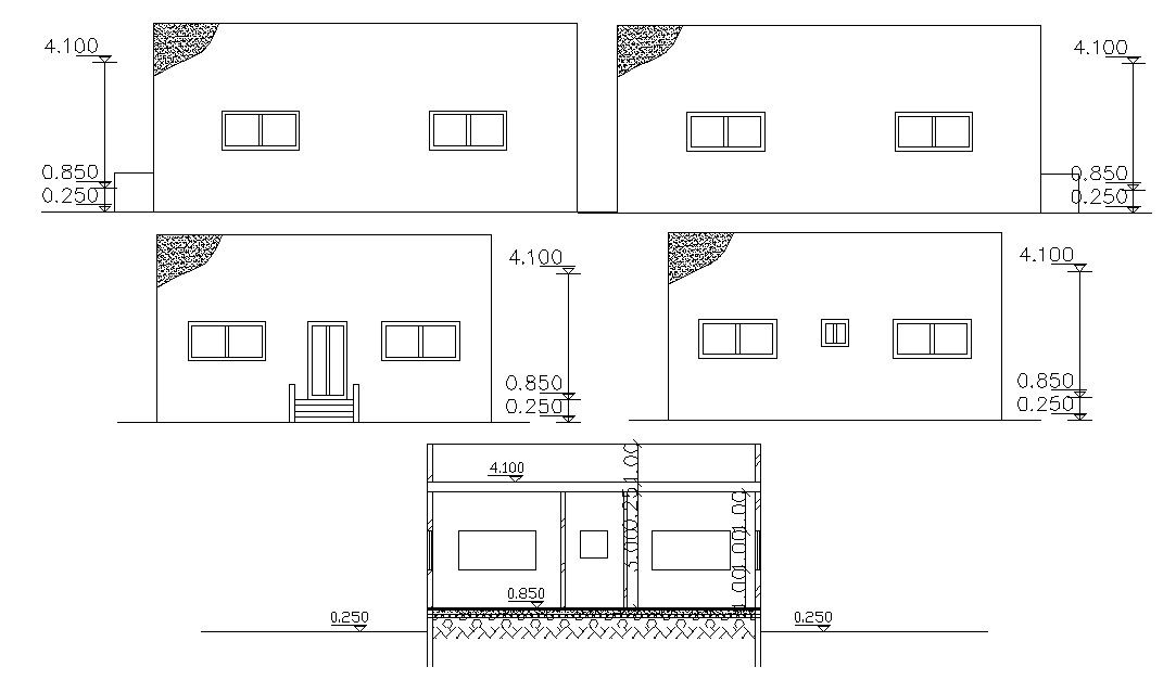 2d CAD drawing of single storey house building elevation design which are viewed from a number of different angles and also can also go with different outdoor designs. download DWG file of house elevation design.