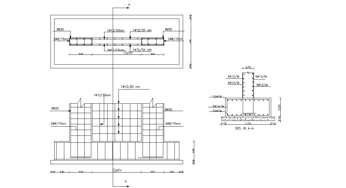 2D CAD drawing shows spread footing which supports two columns is termed as a combined footing foundation structure that both columns carry unequal loads. download free DWG file of RCC combine foundation column section drawing.