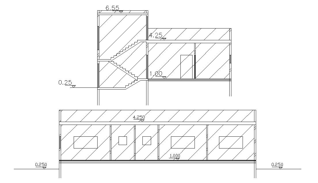 this is the two sections of house building with floor levels, stair section doors and windows design in sections.it's an internal detail of house design.