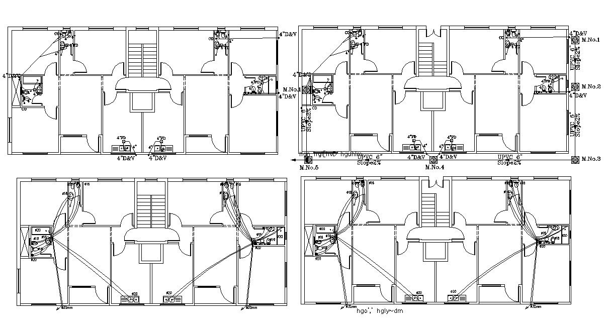 this is the drawing of many floor plan with toilets and kitchen sanitary layout design, drainage pipes layout plan, ground floor manhole details, it's an architectural residential planning with more details.