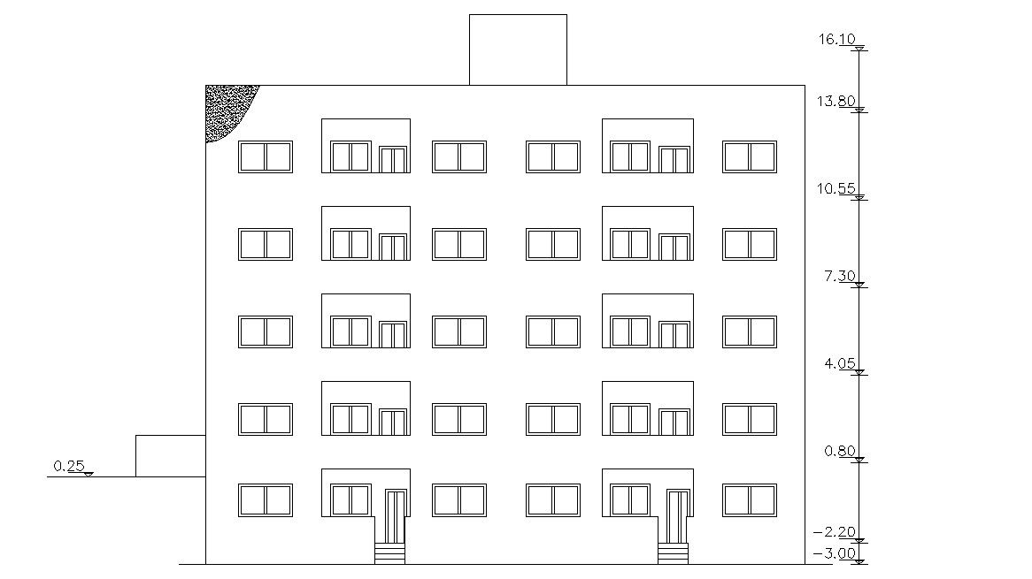 this is the elevation of residential building with floor levels dimension details, it's an Architectural simple elevation design, many doors and windows marking in elevation.