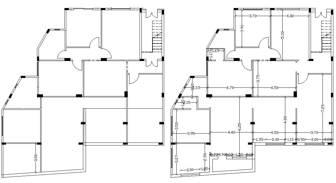 this is the planning of residential building design with internal working dimension details structure column layout plan with lintel marking, in this plan added many rooms, stair, toilets, doors and windows marking in plan and much more other details.
