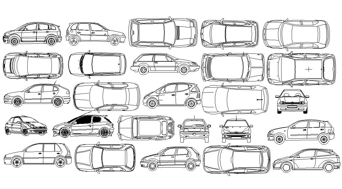 2d CAD drawing shows different types of 4 wheeler car model elevation design CAD blocks. download free car CAD blocks and use in parking plan for improving the CAD presentation.
