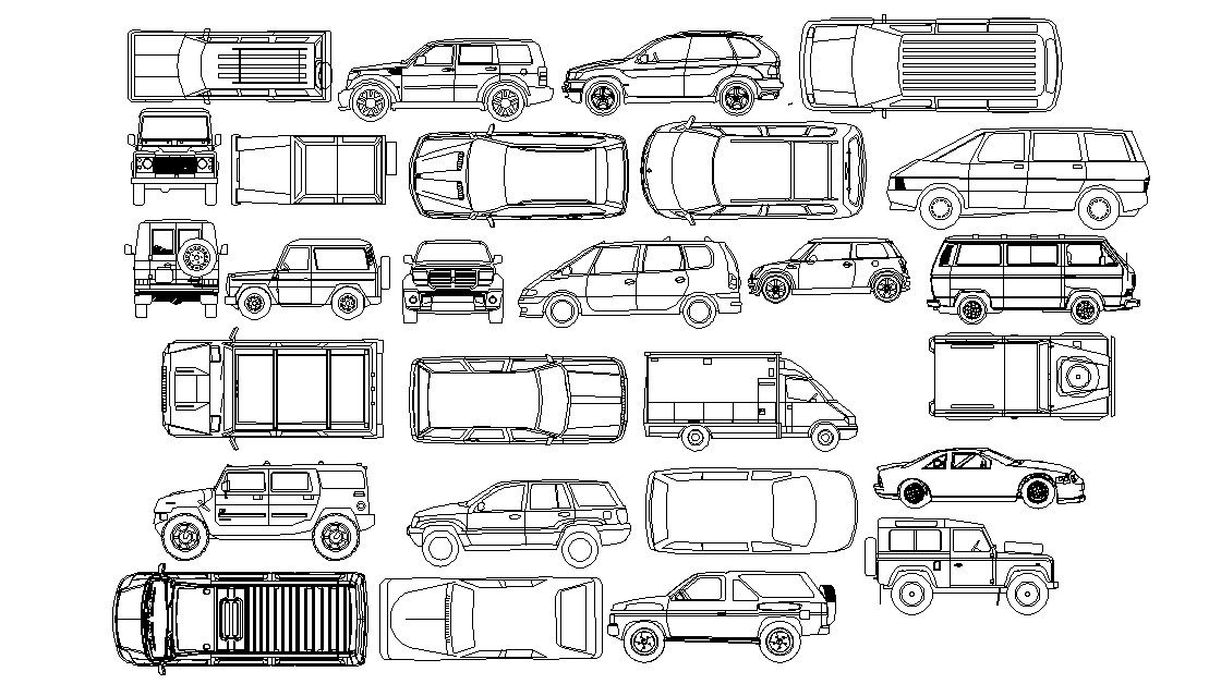 download free 4 wheeler CAD blocks with a number of elevation design like top view, side and front elevation design. find here jeep, car, and van model of CAD blocks.
