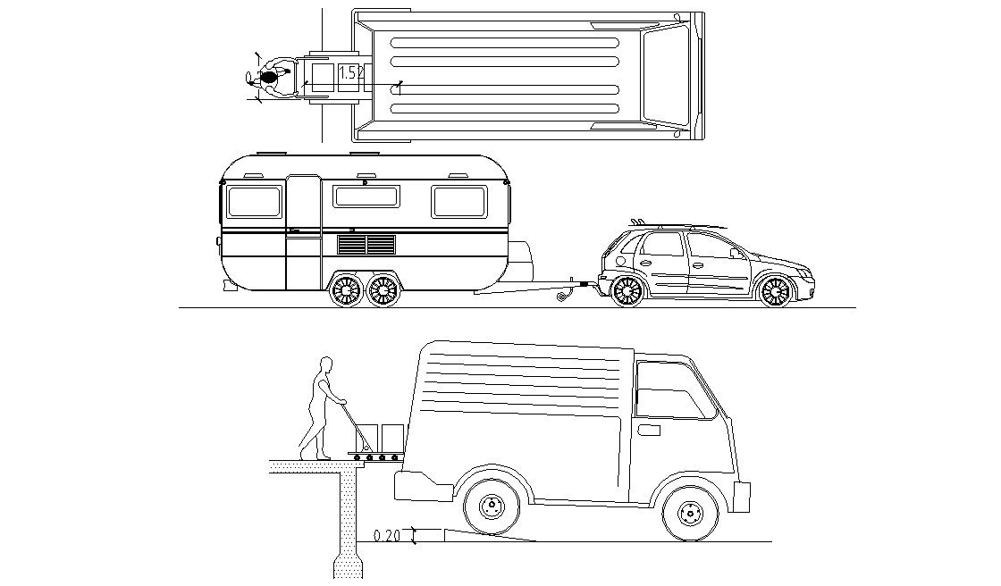 2d CAD drawing of a top view and side elevation design of goods transportation van cad blocks.