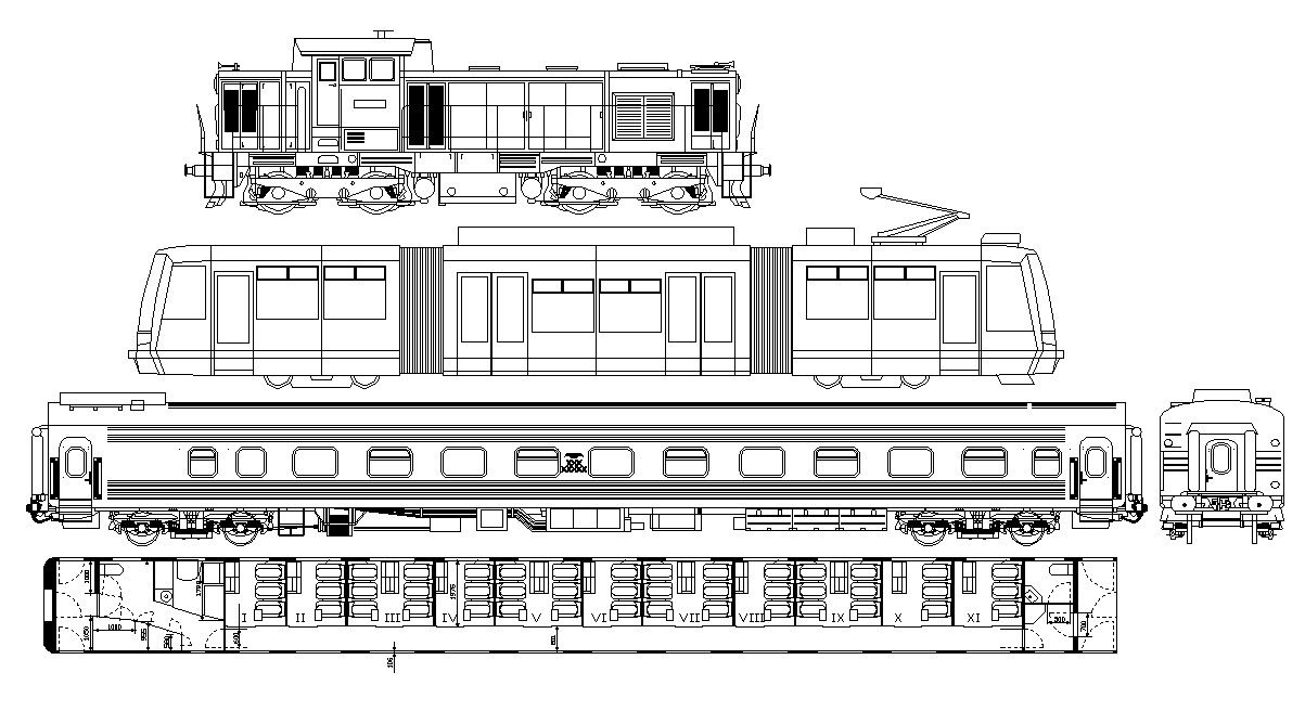 download free DWG file of train CAD blocks AutoCAD drawing shows a train with engine elevation design and seating open section drawing detail.