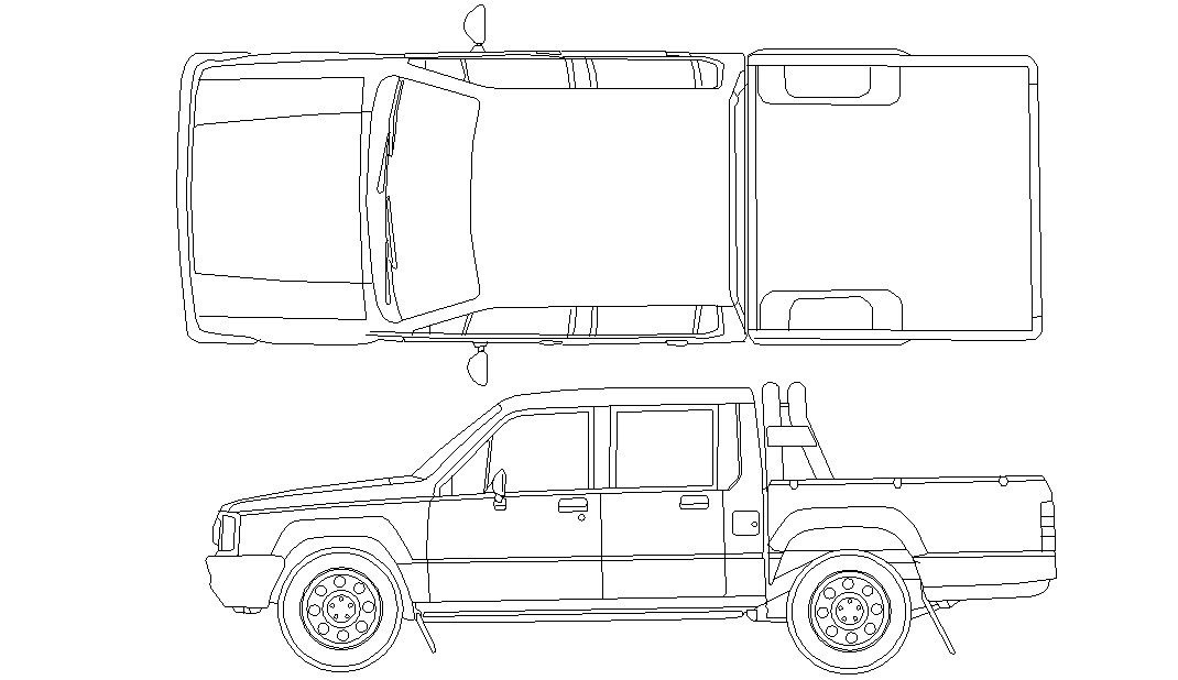 2D CAD drawing to pickup truck top view and side elevation design. download free DWG file of pickup truck CAD blocks.