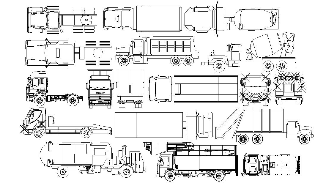 2d CAD drawing of different types of truck elevation design like transportation truck, concrete mixture truck, and loaded truck. download free truck CAD blocks design.