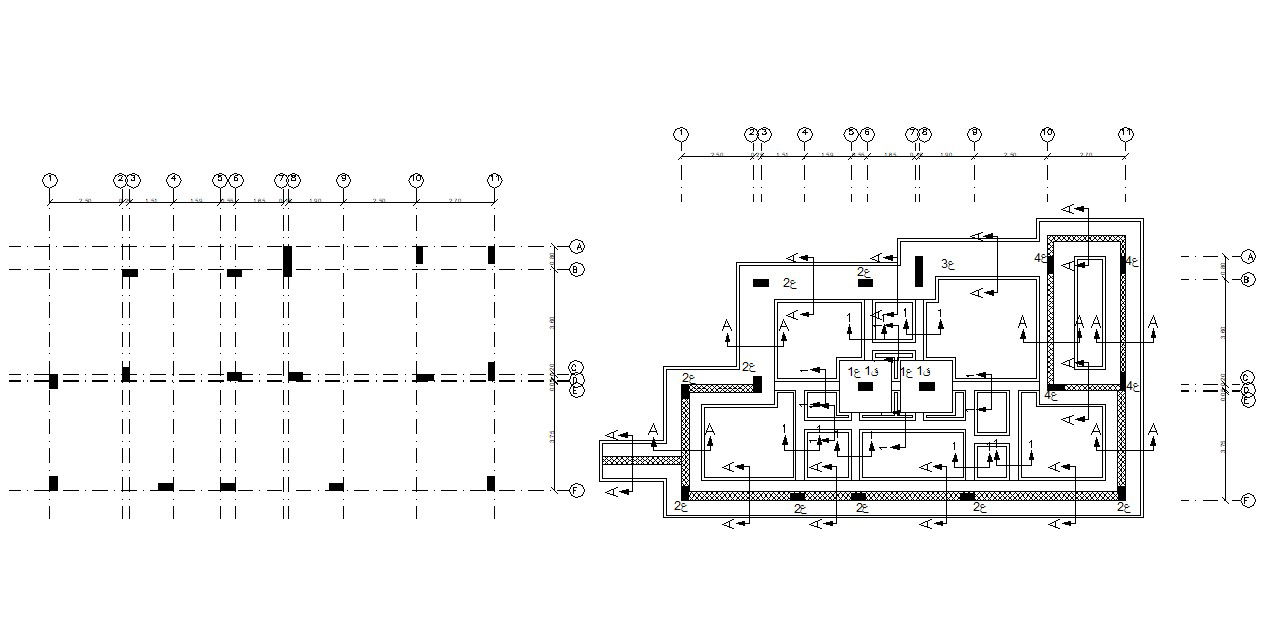 2d CAD drawing details of bungalow construction column arrangement layout plan along with ceiling layout design, centerline design, section line, dimension working set, and various other building various other units details download AutoCAD file.