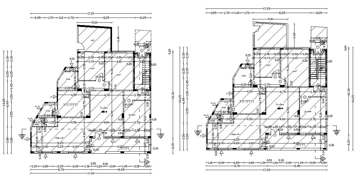 this is the modern bungalow planning with structural column layout design, working drawing dimension details, section line in plan.in this planning added stair, drawing room, bedrooms, kitchen, toilets, backside servant rooms and much more other details in it.