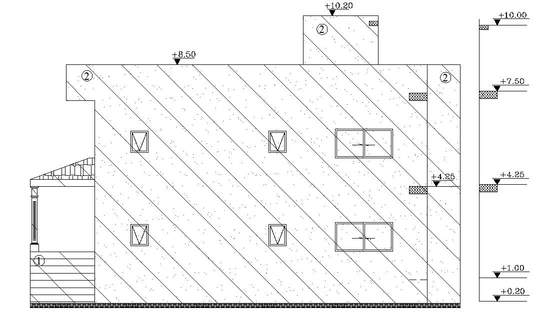 this is the side elevation of huge bungalow design with some different types hatching details with floor levels details and much more other details in it.