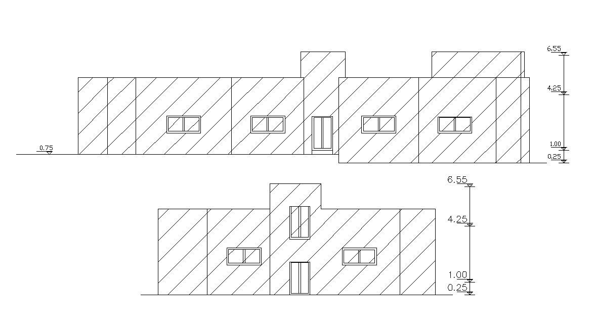 this is the simple elevation design of residential house building includes hatching design floor levels dimension details, doors and windows marking in elevation and much more other details in it.