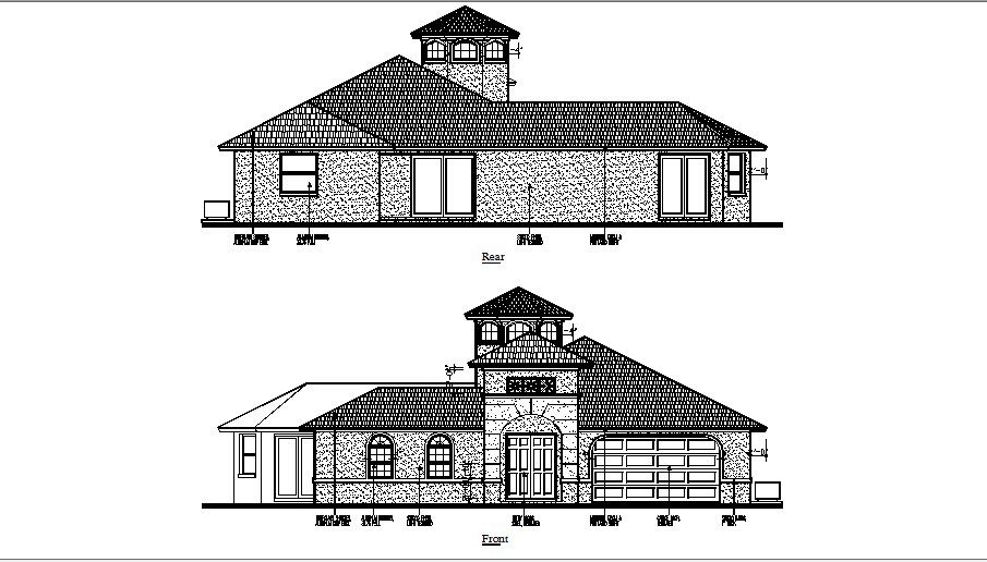 Front and rear side house elevation 2d cad drawing an AutoCAD file include a 2D view of flooring with doors and windows. Staircase view provided. Balcony and wall designs with dimensions and scale, roof or terrace view in DWG file format.
