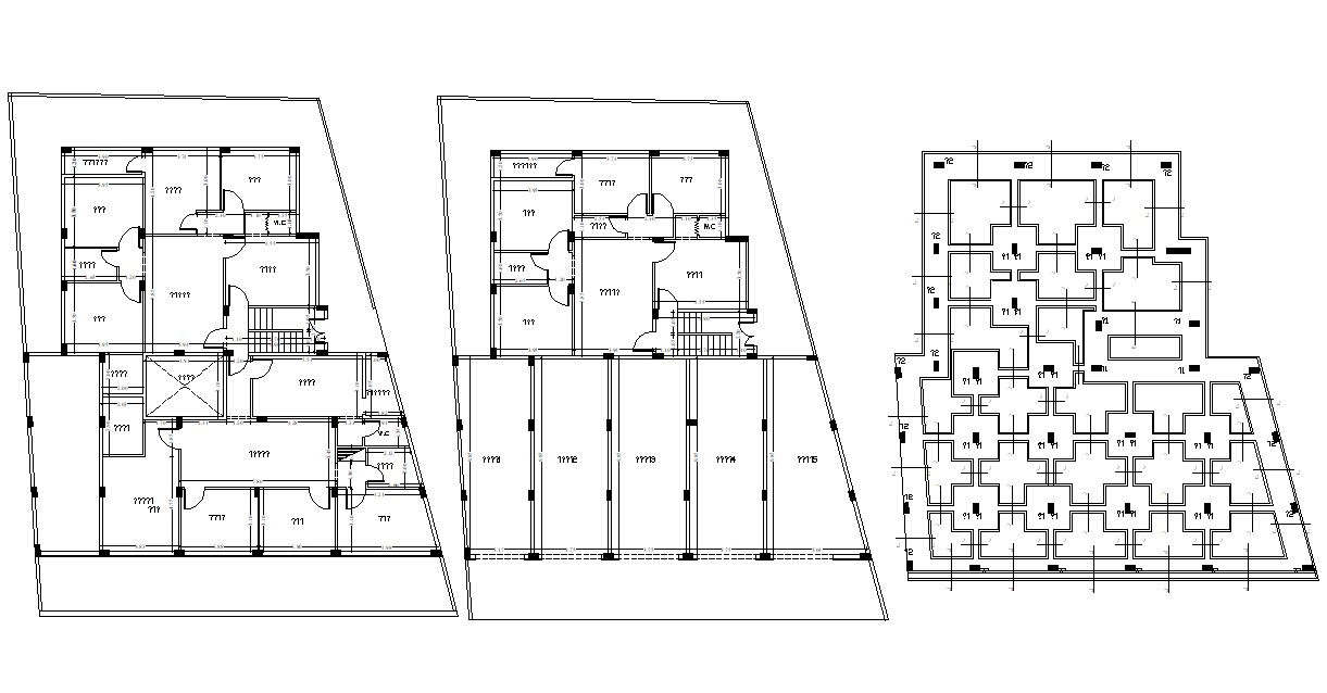 this is the planning of apartment design with front side commercial part. structure column layout design, column foundation with excavation line in it.in the residential part added drawing room, kitchen, dining, many bedrooms, toilets and other more details related to the house.