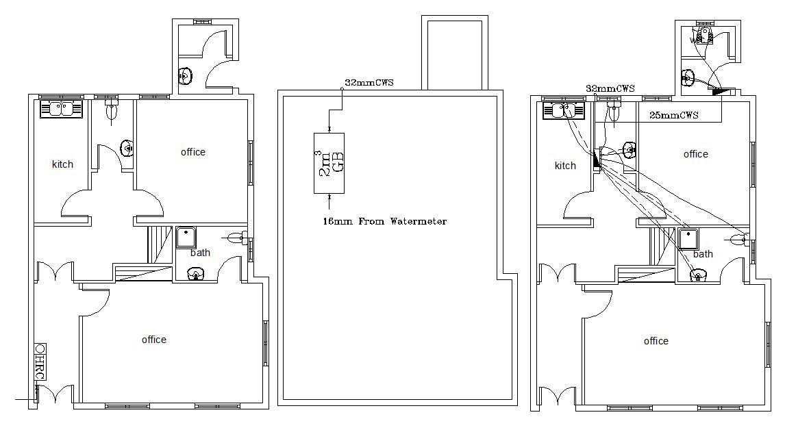 2d CAD drawing of office ground floor plan and terrace plan with plumbing layout plan which shows water pile and drainage pile line plan. download DWG file of office plumbing layout plan AutoCAD drawing.