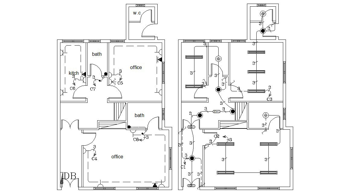 the interior design of office electrical layout plan CAD drawing shows false ceiling lighting point layout plan and wiring layout plan. download DWG file of office electrical wiring plan AutoCAD drawing.