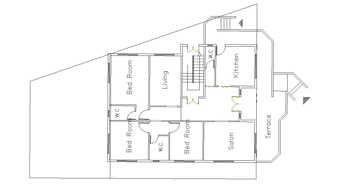 the architecture plan of 3 bedroom house plan CAD drawing shows site plot with compound wall and build up area detail. download DWG file of house floor plan AutoCAD drawing.
