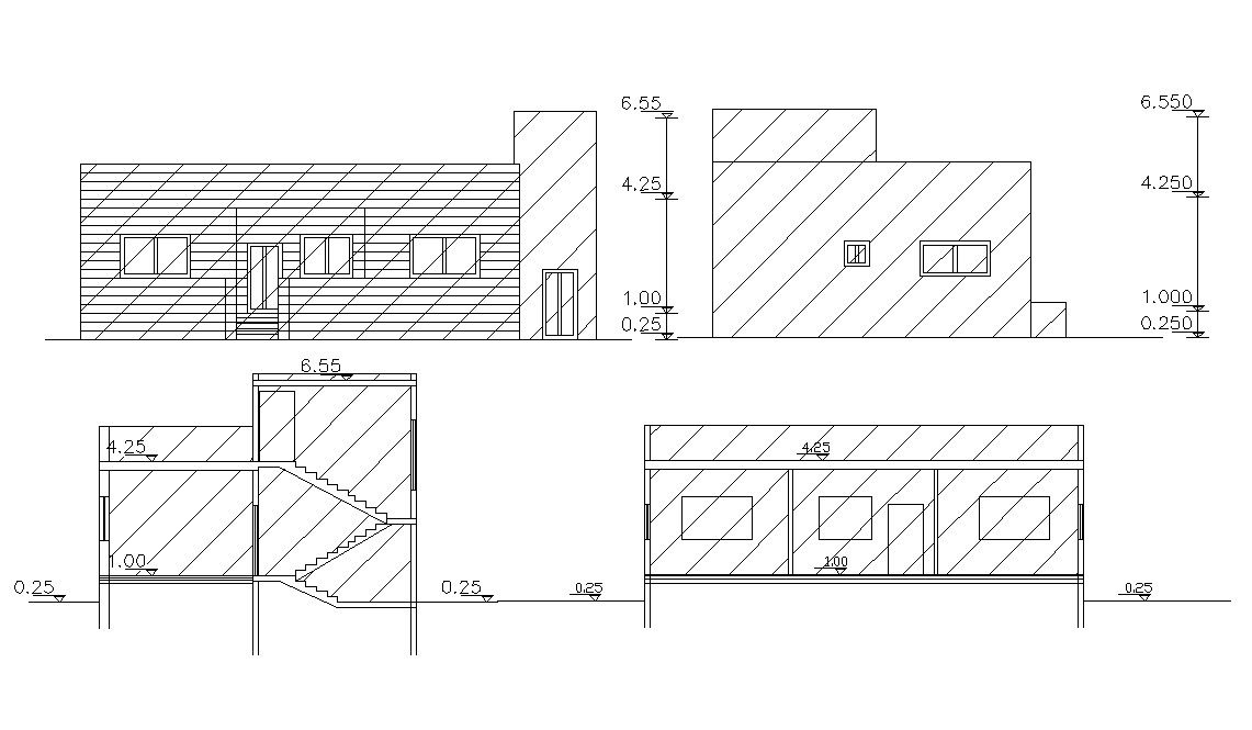 this is the drawing of two elevations and two sections details, this is the simple style elevation with floor levels dimension details. stair section design, some hatching in elevation and much more other details related to drawing.