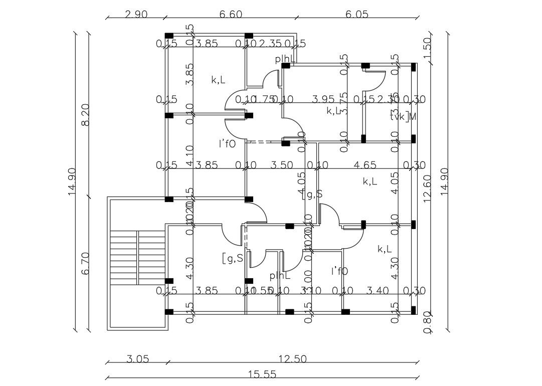 this is the drawing of residential house design with working drawing plan, structural column layout design, this is the simple architectural floor plan includes many rooms stair, passage and other more details.