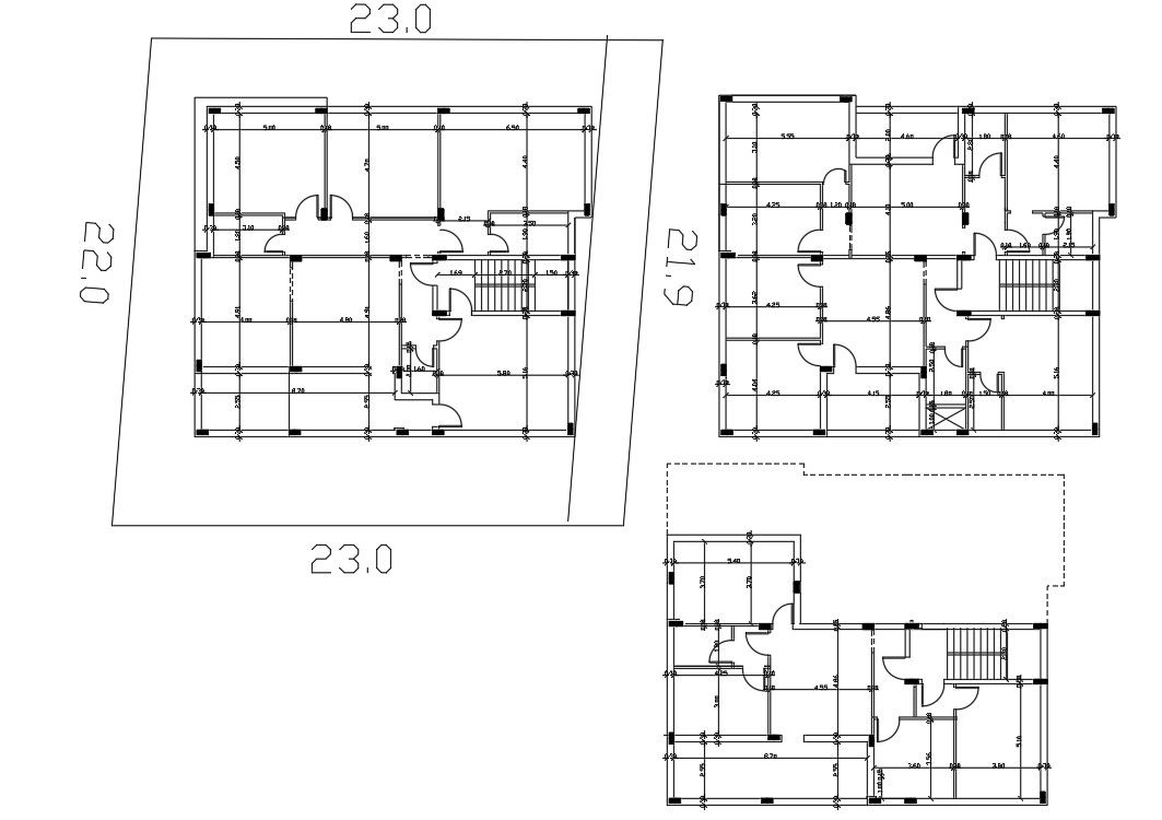 this is the three-floor plan of residential house design with working drawing dimension details, structural column layout plan, plot dimension details.in this planning added drawing room, kitchen, bedrooms, toilets, stairs, top floor plan and other more details.