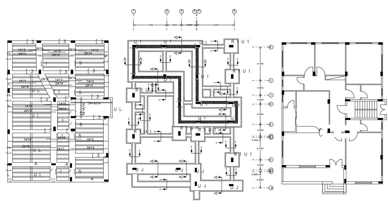 this is the drawing of column footing details plan with peripheral excavation design, structural column latout plan, residential floor planning, centerline plan with dimension details, reinforcement bars calculation and other more details related to drawing.