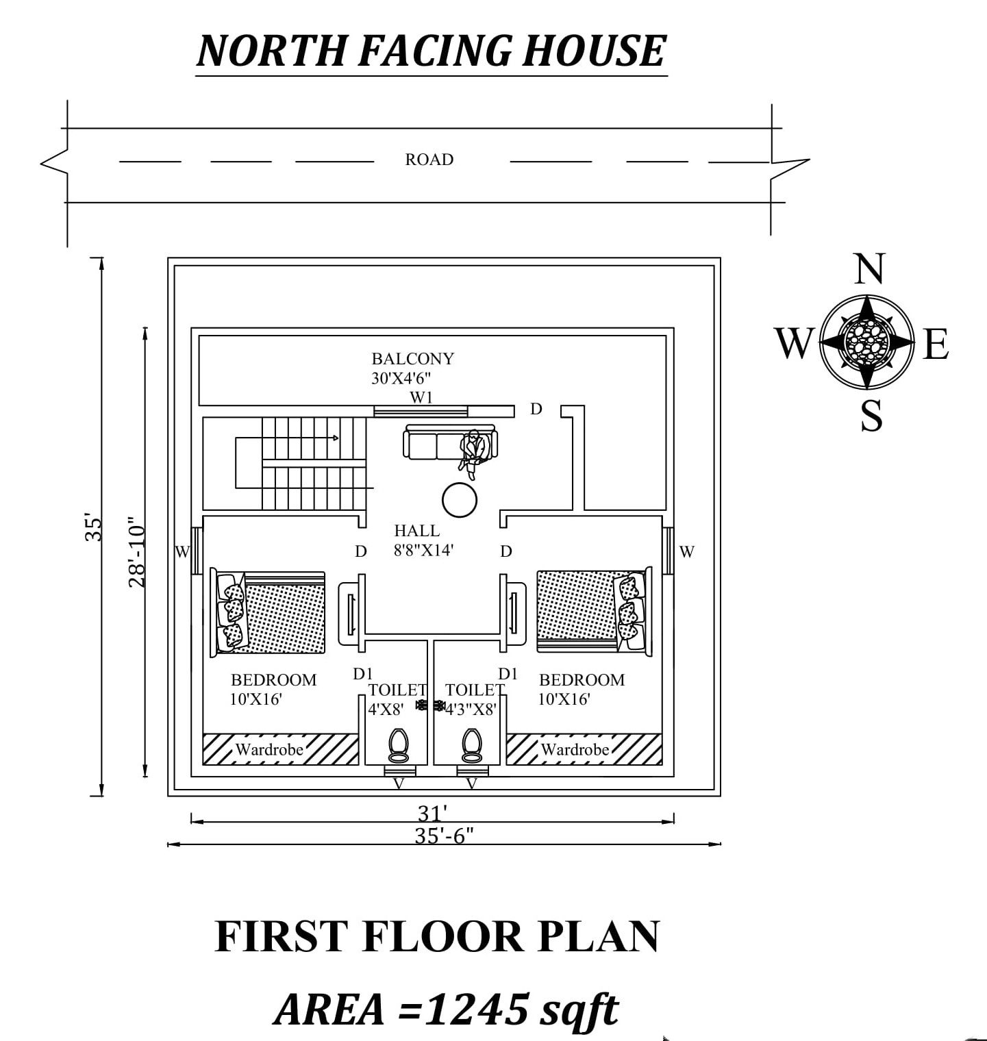 Autocad Drawing file shows 35'x35' Fully Furnished wonderful Duplex house First floor North facing house plan As Per Vasthu Shastra. The total buildup area of this house is 1245 sqft. The living area is available in the Northeast direction. The master bedroom available in the southwest direction with the attached toilet is in the south direction. The kid's bedroom available in the southeast direction with the attached toilet is in the south direction. A staircase is available in the Northwest inside of the house. The Balcony is available in the north direction of the house. Download Autocad Drawing file and PDF file.
