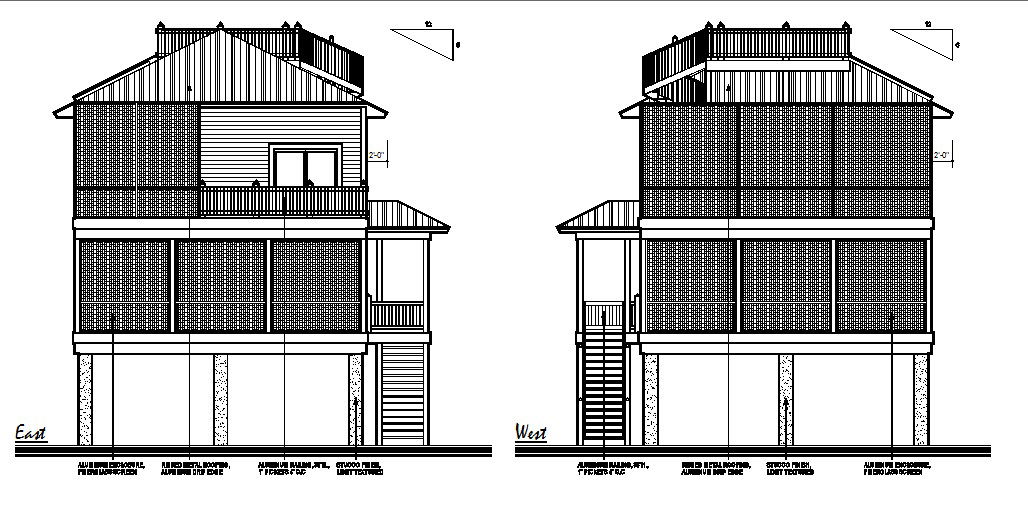 East and west side elevation of three story residential house autocad drawing an AutoCAD file includes 2D view of flooring with doors and windows. Staircase view provided. Balcony and wall designs with dimensions and scale, roof or terrace view in DWG file format.