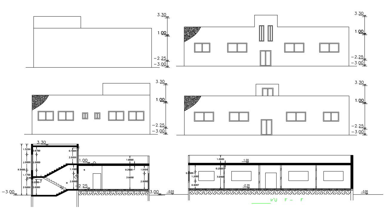 this is the drawing of four side elevations and two sections of small house design includes floor levels details, stairs section, some texting details related to drawing.