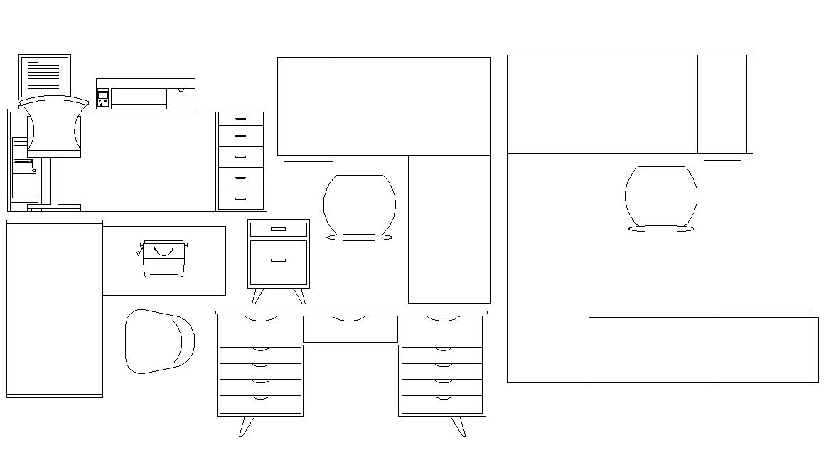 2d CAD drawing of office furniture CAD blocks design includes work desk table with chair, drawer table and rolling chair. download free DWG file of office furniture CAD blocks AutoCAD drawing.