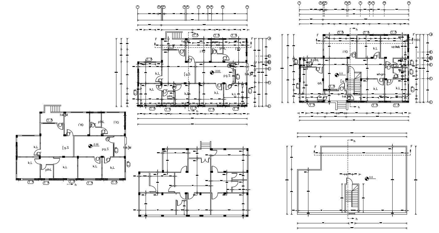 this is the residential building floors plan with working drawing dimension details, centerline plan, column layout design, terrace floor plan with levels marking, doors and windows demarcation in plan.