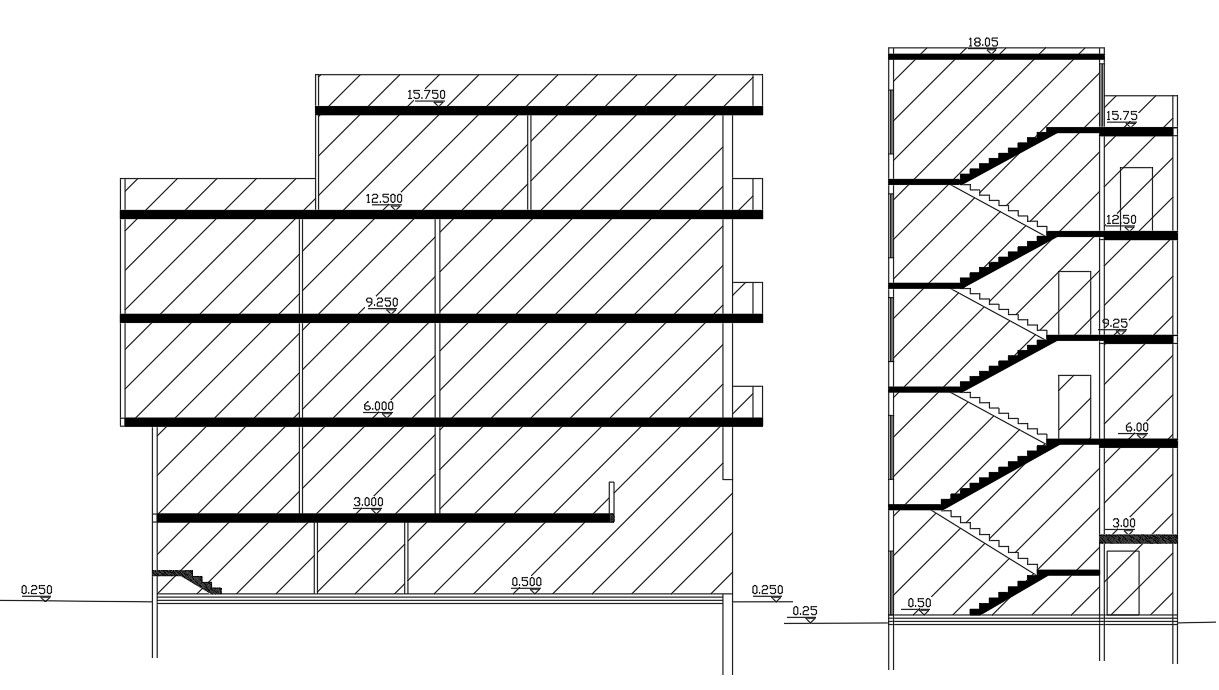 this is the two sections of apartment building design with floor levels dimension details, stair standard section, hatching design in section and other more details related to structure.
