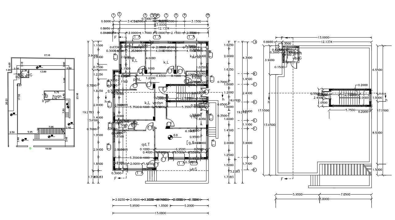 this is the planning of huge bungalow layout design with working drawing dimension details, terrace floor plan with stair cabin details, plot and building demarcation survey drawing with peripheral dimension details.
