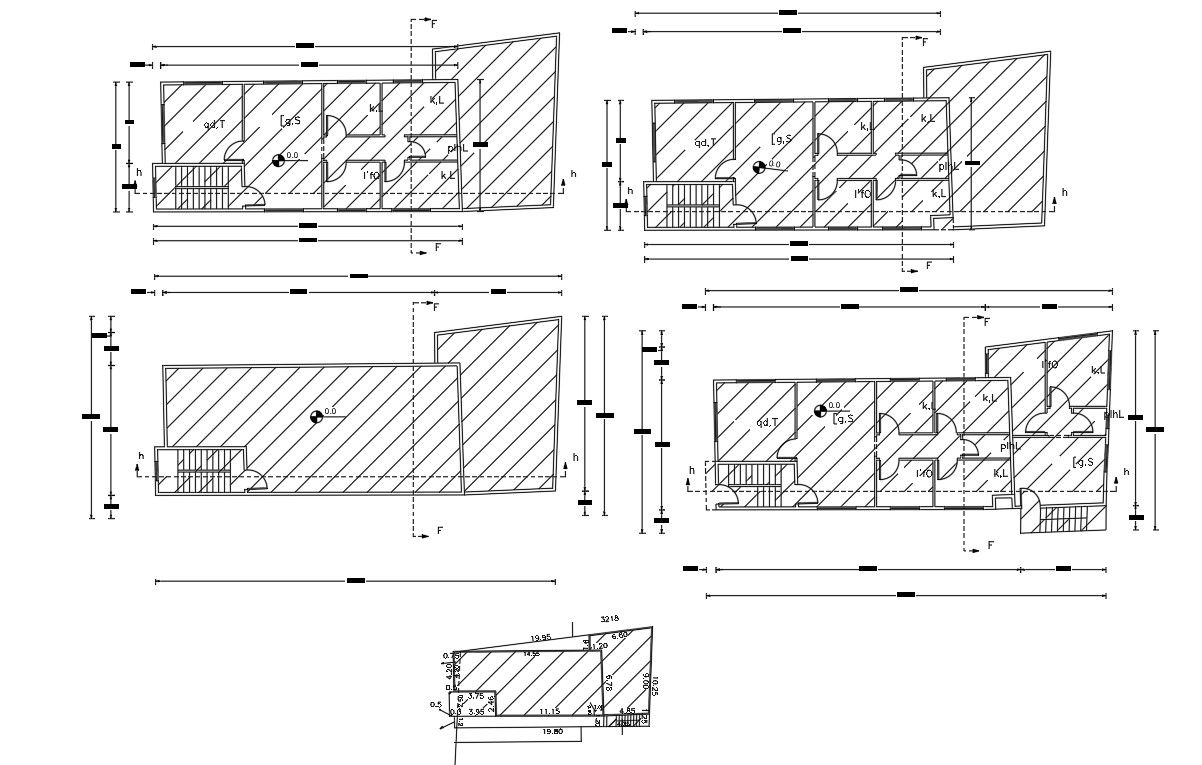 this is the planning of apartment design with working drawing dimension details. terrace floor plan, site and building demarcation details in the drawing, in this planning, added drawing room, kitchen, bedrooms, toilets, terrace and other more details.