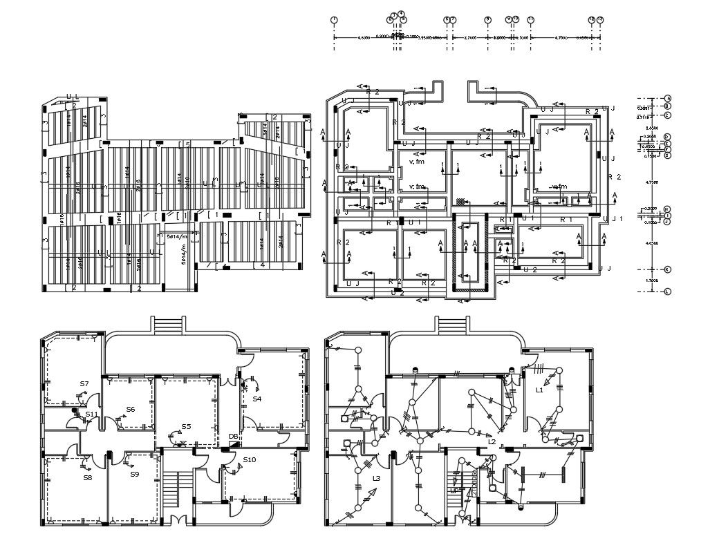 this is the drawing of column foundation design includes centerline plan peripheral excavation line out plan, structural column layout design, working dimension details, electrical plan of house, beam and column marking in slab design.this is the huge modern bungalow plan.