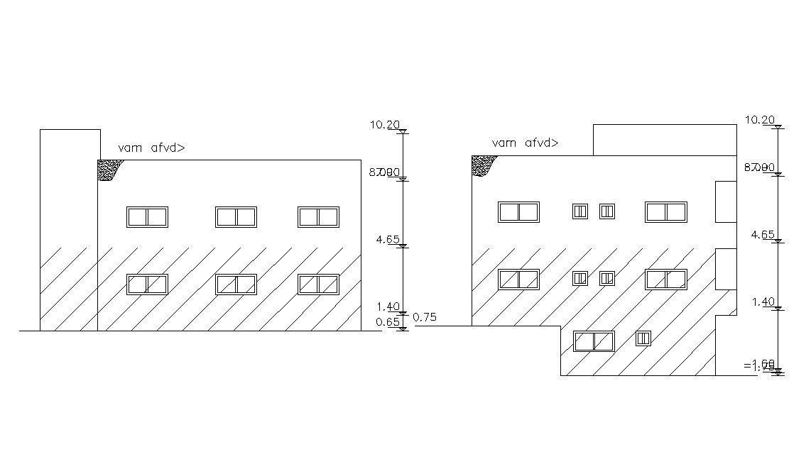 2d CAD drawing of residence house building elevation design with dimension detail CAD drawing shows floor level building structure detail. download free DWG file of house building CAD drawing.