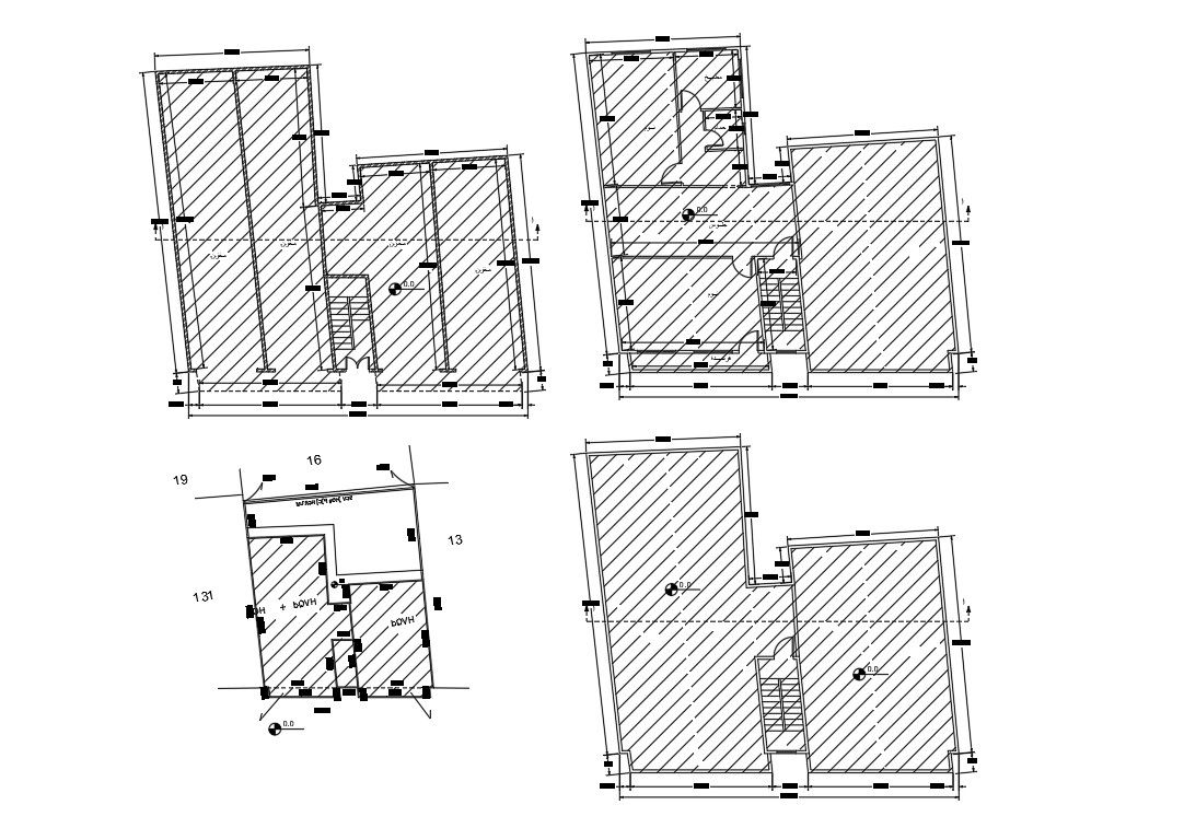 2d CAD drawing of house ground floor plan with different floor design and margine dimension detail. download free DWG file of house construction beginning working plan with hatching design.