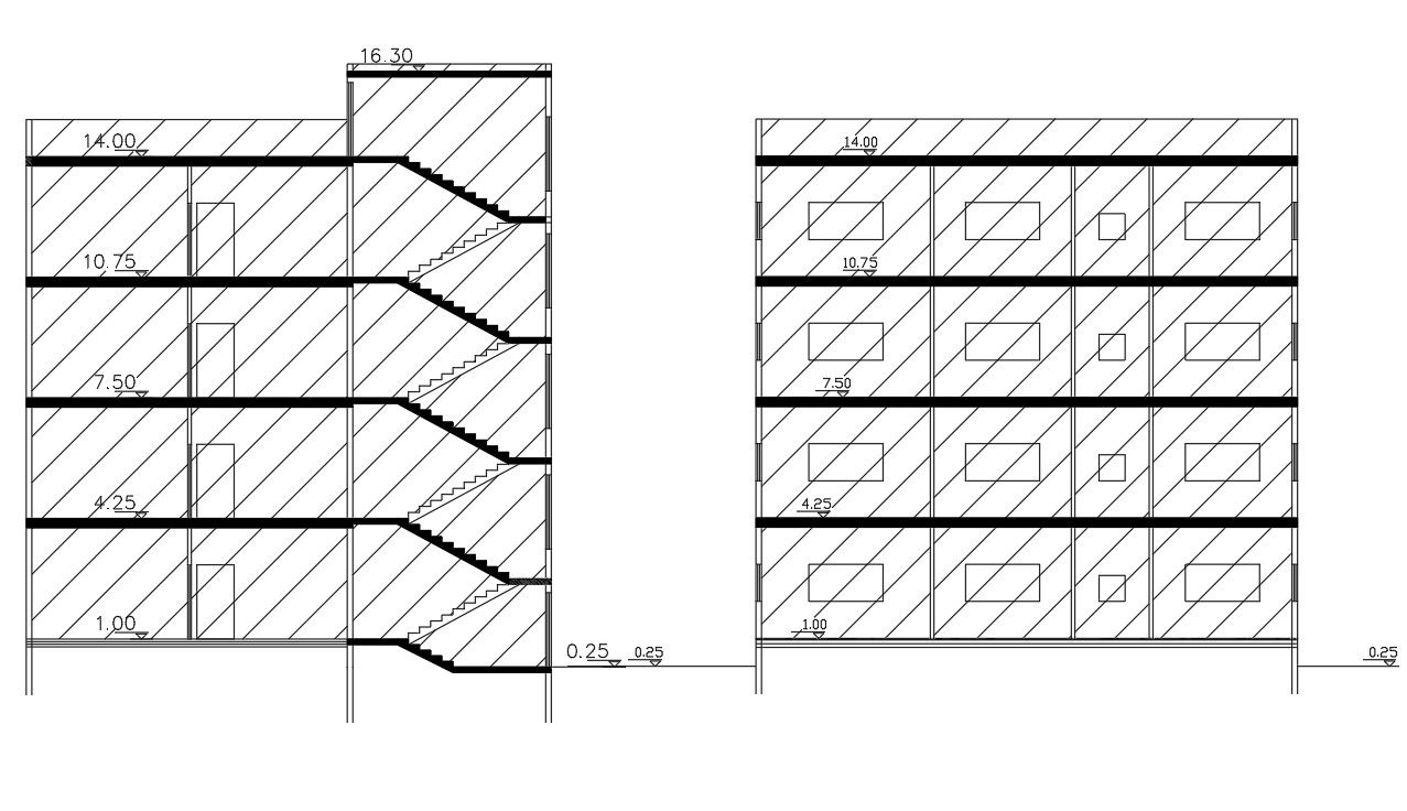 the architecture apartment building cross-section drawing includes RCC floor slab, staircase and wall section drawing margination detail. download DWG file of apartment building drawing with hatching detail.