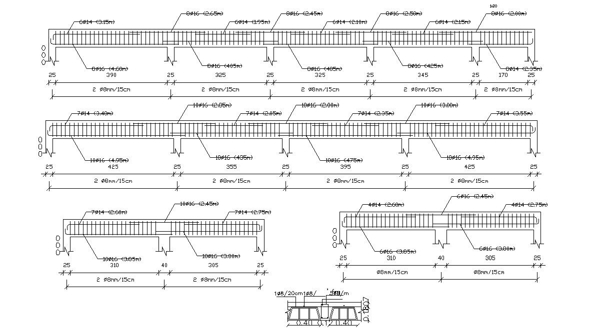 CAD structural blocks details of RCC column and beam design that shows column spacing details, column and beam structure reinforcement bars details, main and distribution hook up and bent up bars design, bar dimension, effective and clear cover, stirrups, and various other structural blocks details download AutoCAD file.