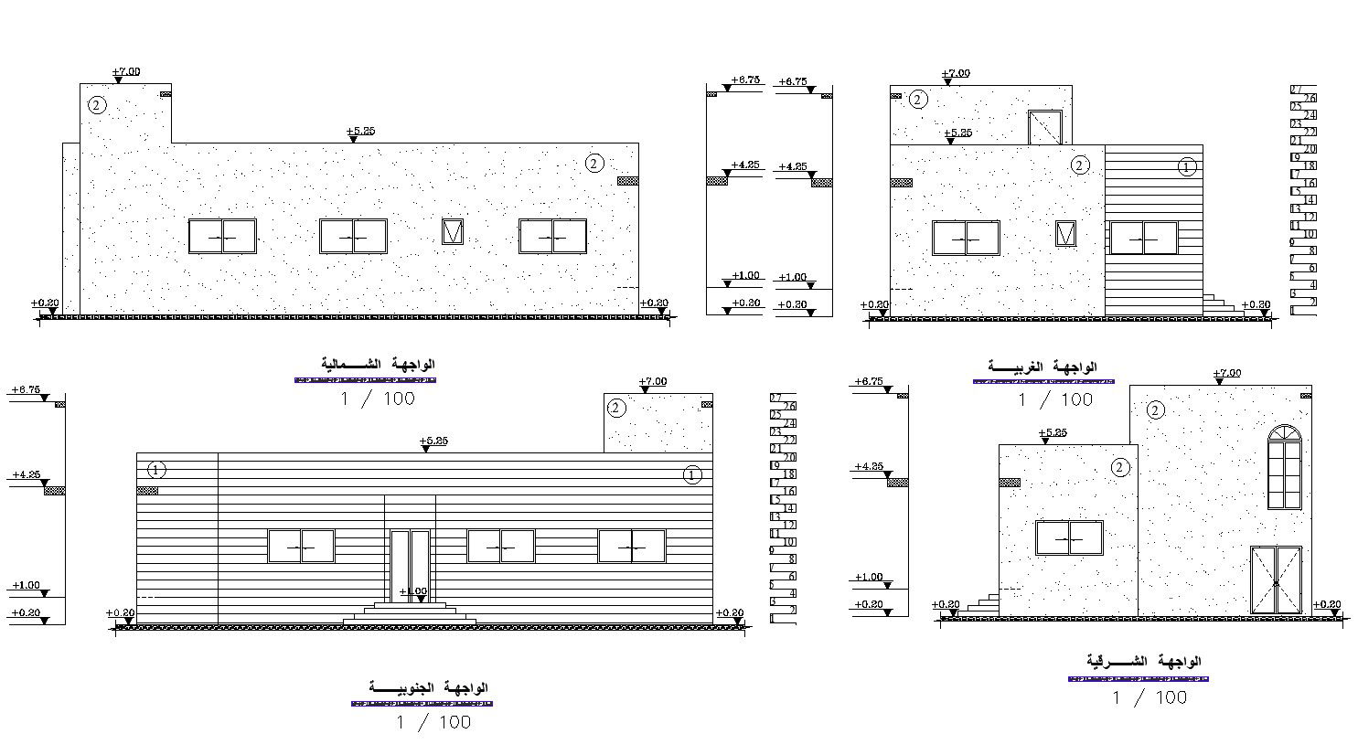 this is the simple four elevations of single floor house building design with floor levels dimension details, hatching design in elevations, doors and windows marking in elevation and sections.