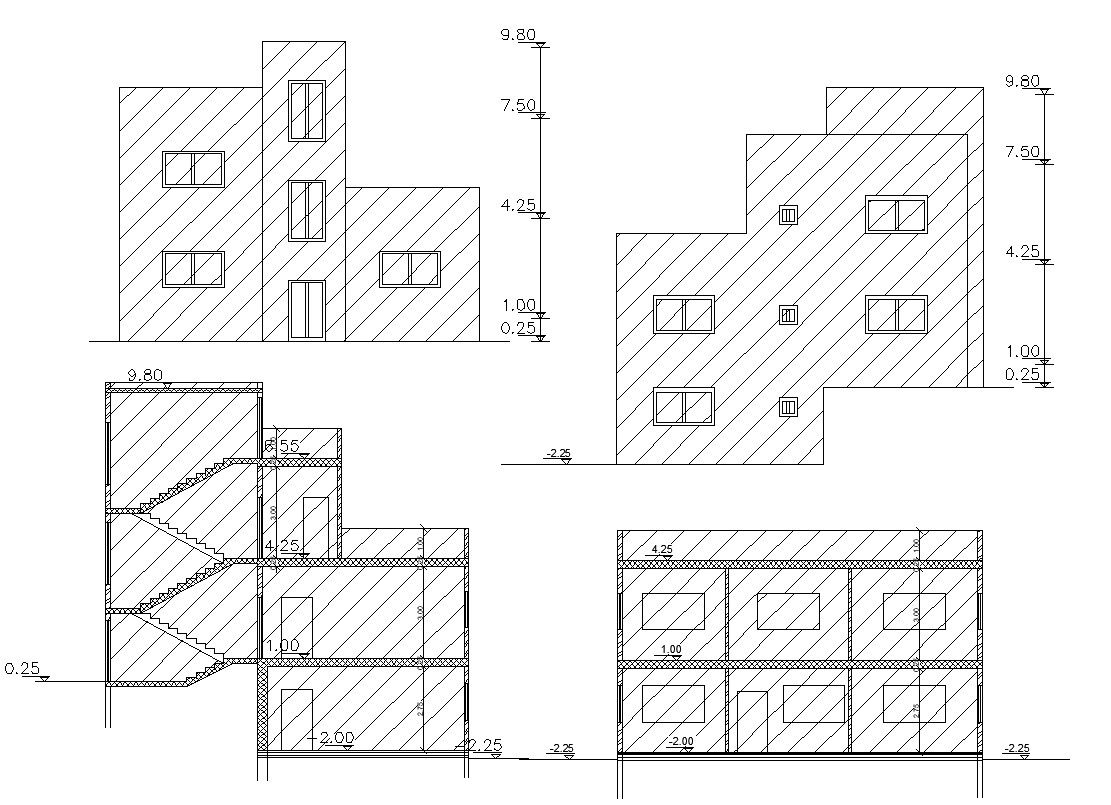 this is the drawing of simple architectural elevations and sections details with floor levels dimension details, some hatching desing in it.doors and windows design in elevations and sections, standard stair section with structural details.