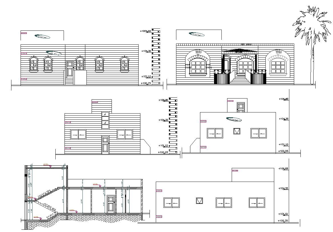 this is the drawing of small house design with floor levels dimension details, some hatching design in elevations, stair standard section with structural detail, round shape whether shade and this is the simple desing of house.