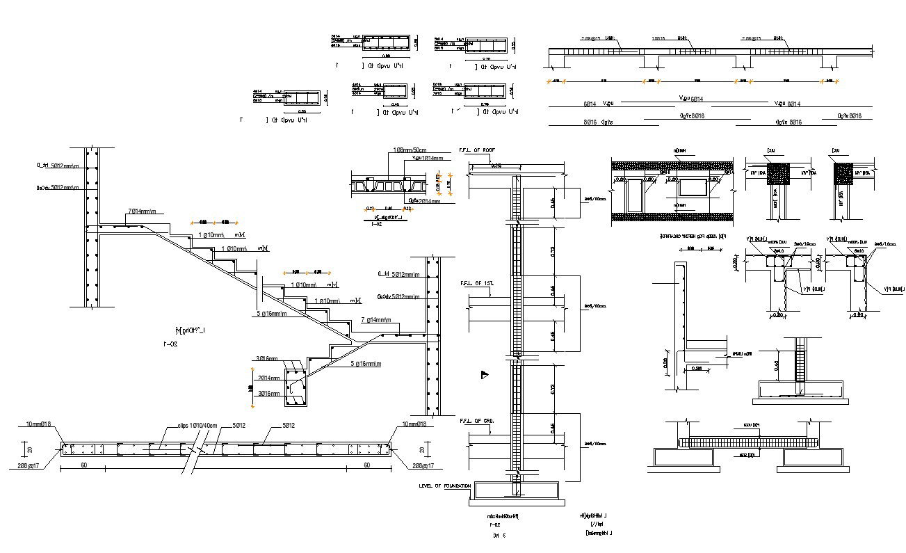 this is the many structural drawing of stair, beam, column, foundation, reinforcement bars calculation details, some tread and riser design in it. bars texing details and much more other details related to structure.