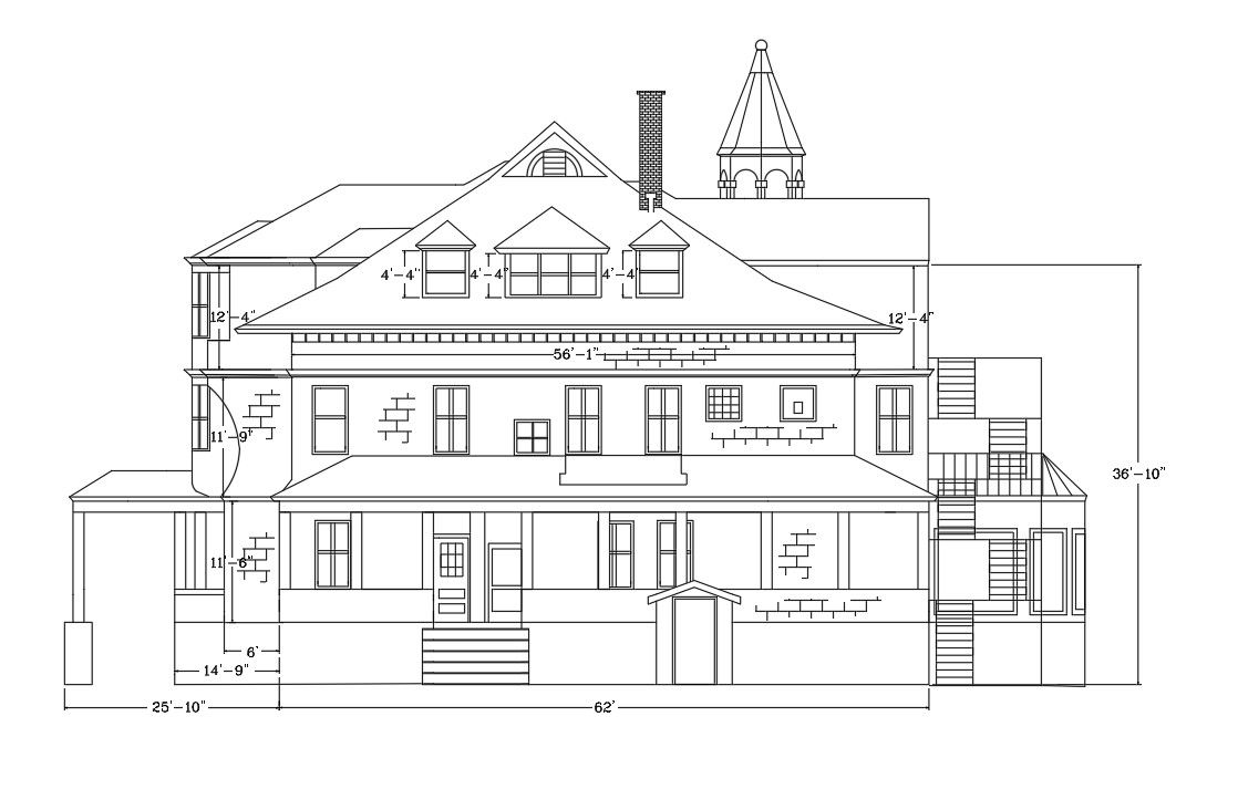 2D CAD drawing of residence bungalow building front elevation design with dimension detail and building structure design. download DWG file of house bungalow elevation drawing.