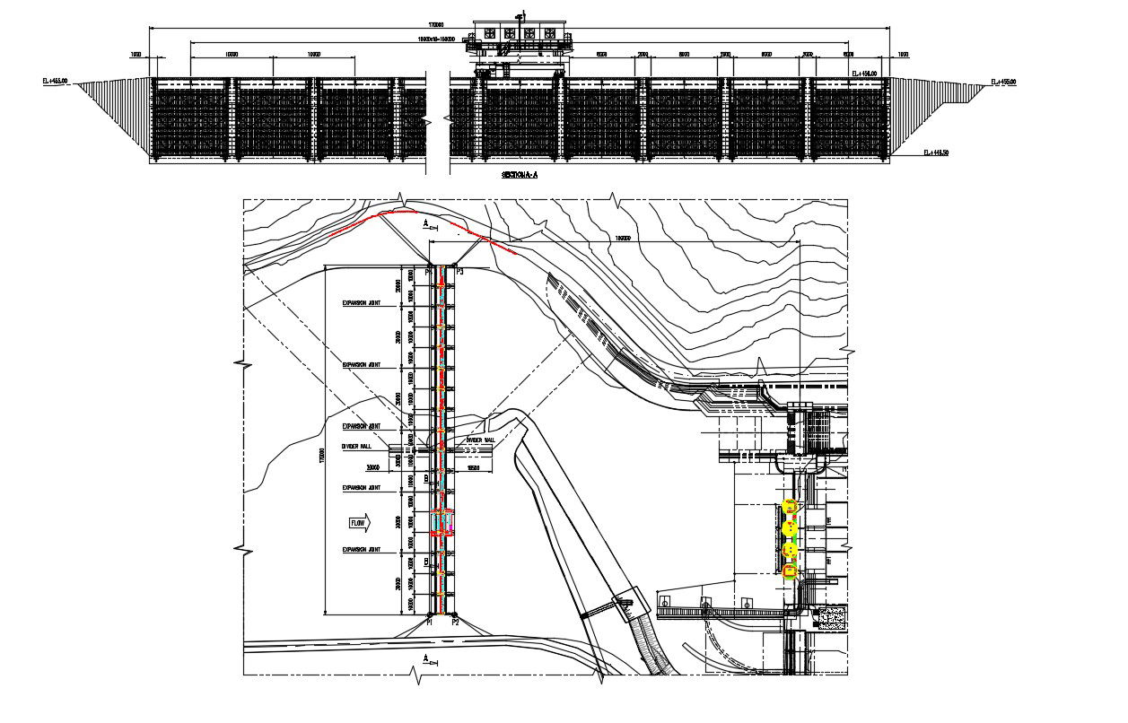 this is the drawing of contour plan with truss rack details, many levels of contour, layout intake, expansion drawing, divider wall, and other details in this plan.