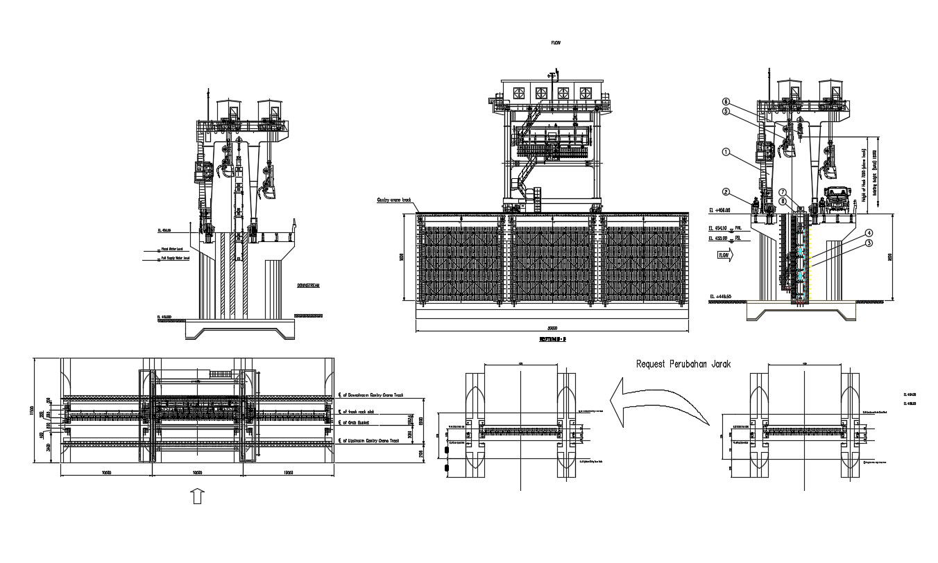 this is the drawing of layout Trashrack Rinaldi pakai bucket with bridge machinery details, some other details for base RCC work.