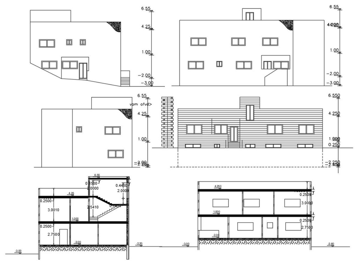 2D CAD drawing of architecture house building section and elevation design with dimension detail and also find RCC floor slab and staircase detail. download DWG file of house building design with a number of different side sectional elevation design.
