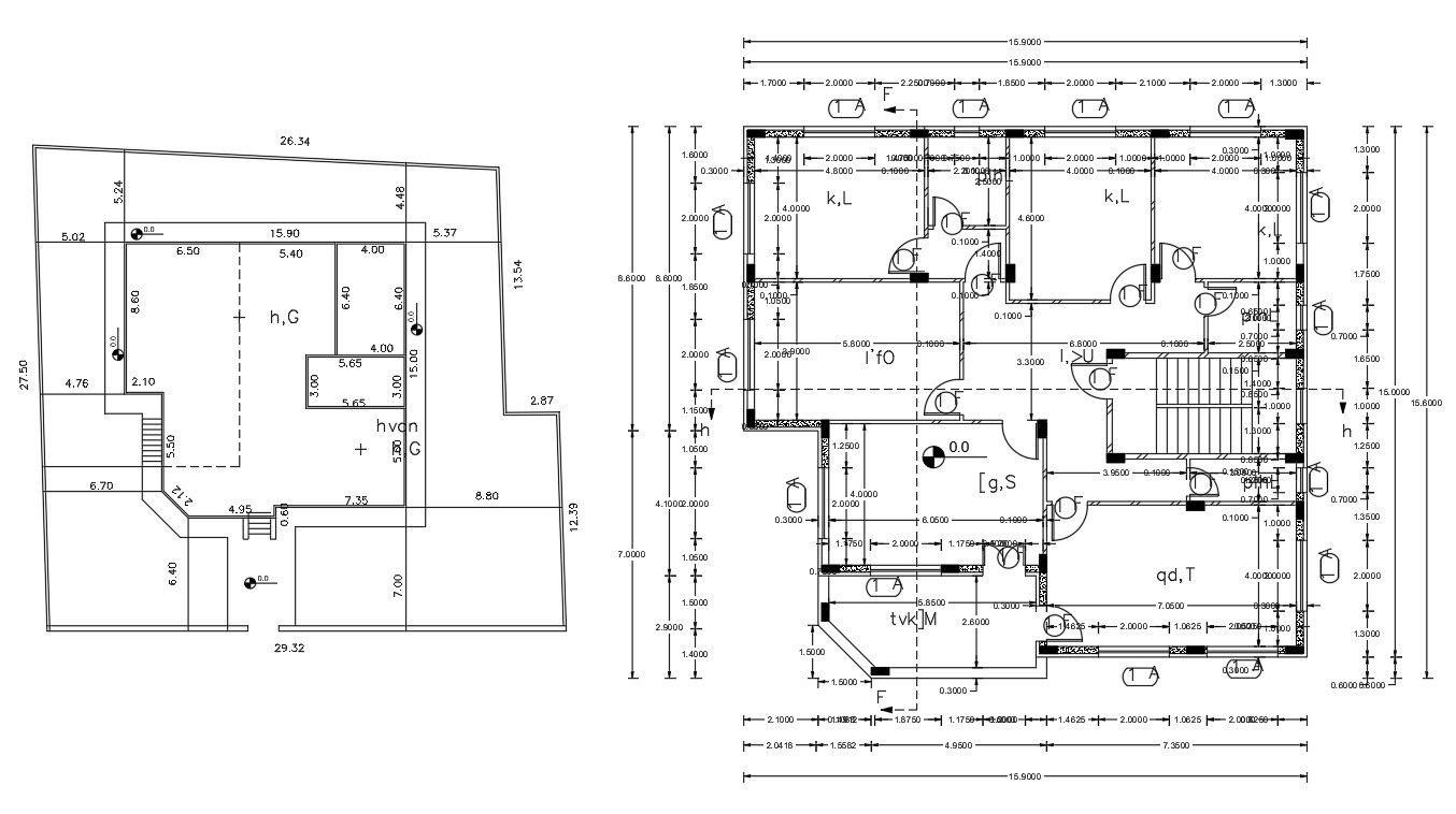 this is the drawing of bungalow planning with working drawing dimension details, bedrooms, dining area, living room, toilet, wash area, kitchen, storage area, entrance, etc