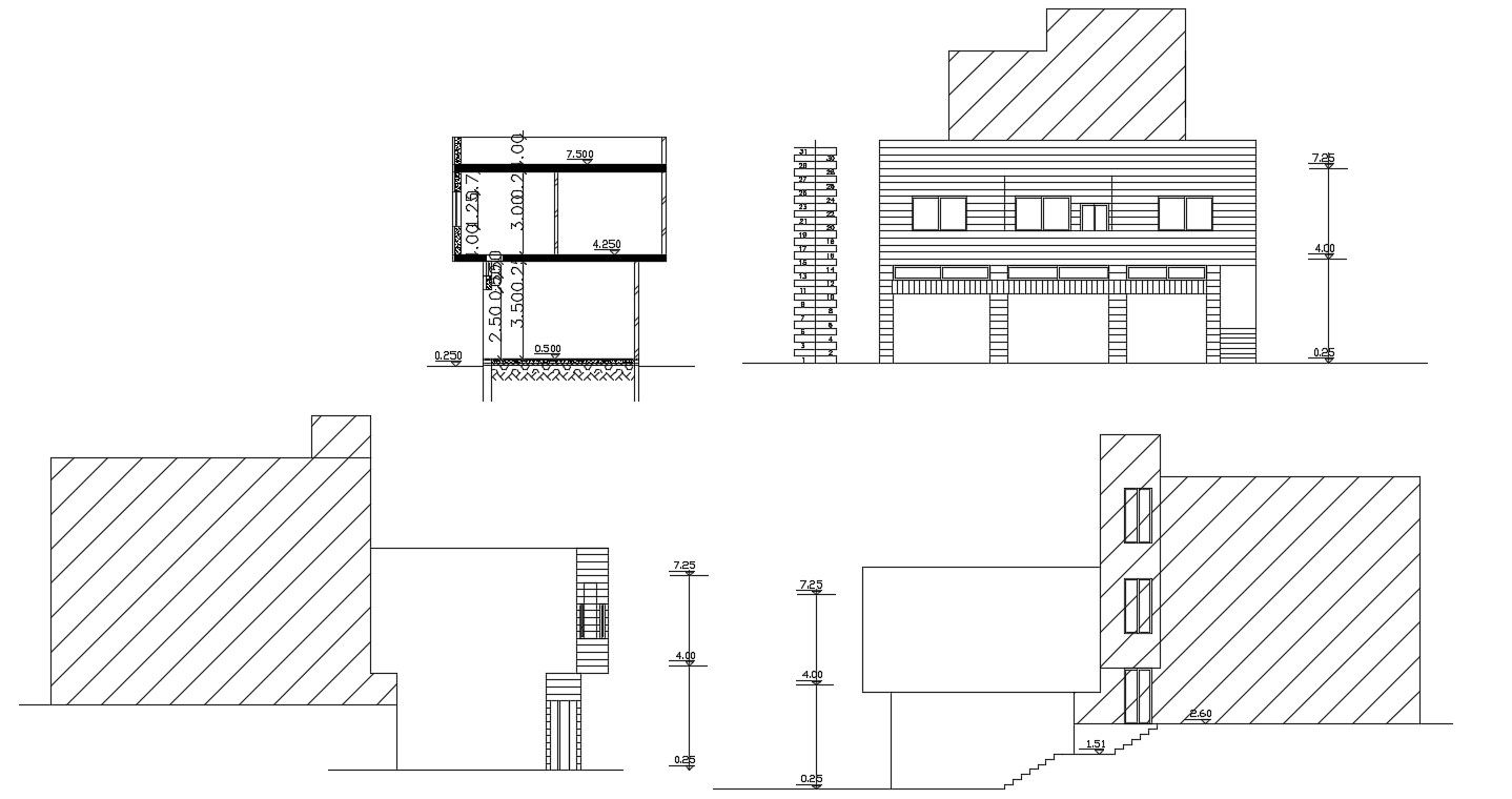 Download free DWG file of house building front elevation design and sectional with AutoCAD hatching drawing and dimension detail.