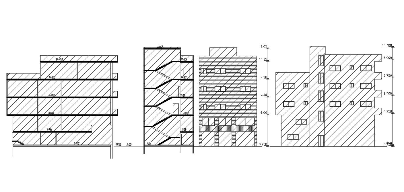 2D CAD drawing of apartment building sectional elevation design with AutoCAD hatching. also, get house building 4 storey structure design with all dimension detail. download DWG file of house building AutoCAD drawing.